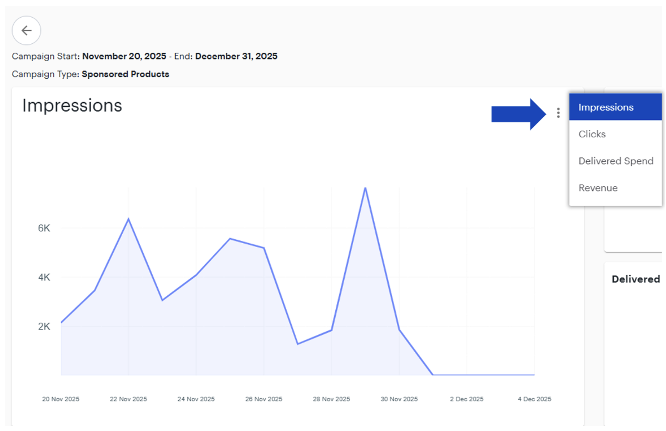 - After selecting the campaign you would like to review, you’ll see options to view and customize its data. In the Single Campaign View screen, use the ellipses menu in the top-right corner to toggle different metrics on the trend line graph.