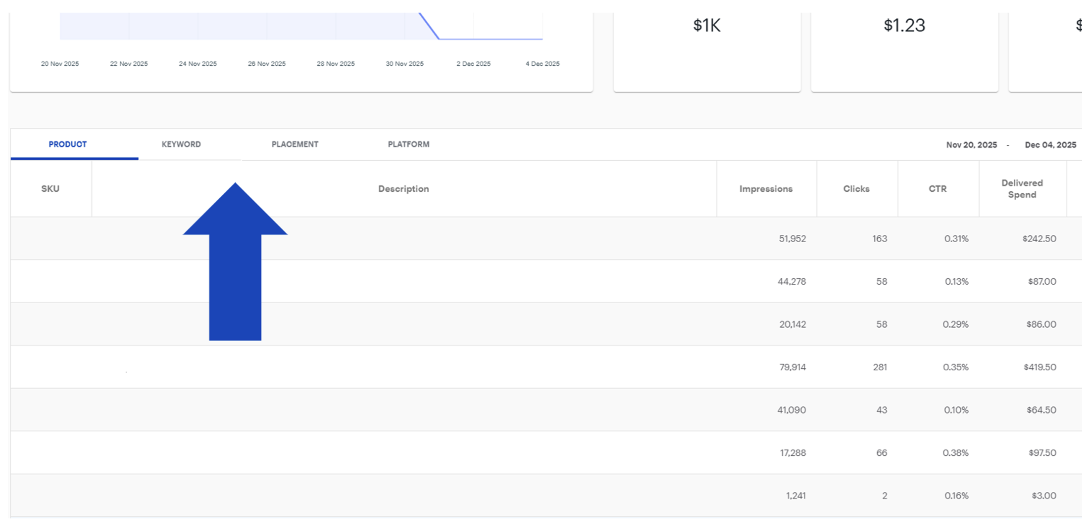 - Keyword: Displays the top 1,000 keywords ranked by delivered spend. This view helps to understand which search terms are driving engagement with active sponsored product SKUs and their relative importance to overall campaign performance.