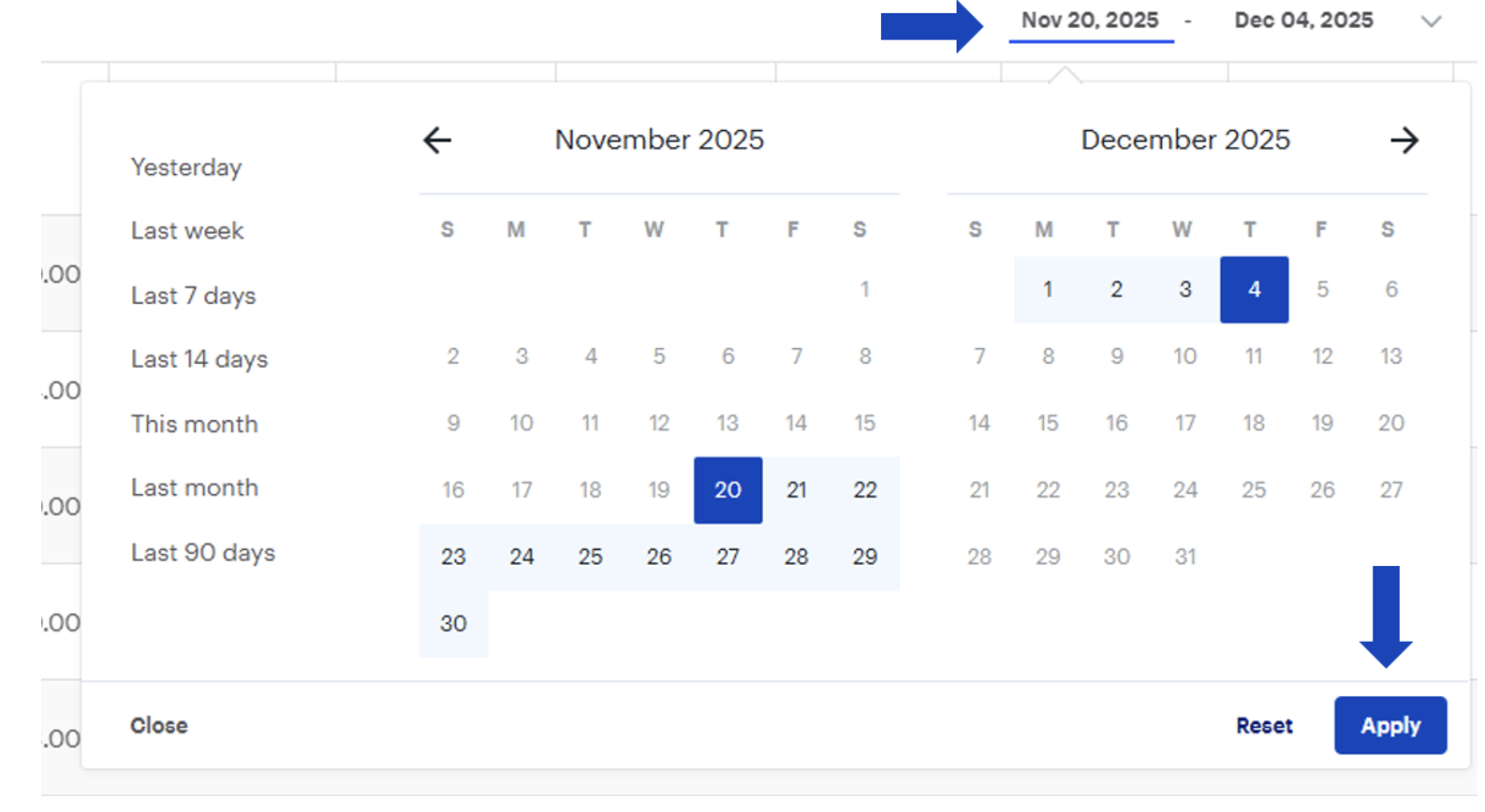 - To adjust the reporting timeframe, use the date picker to choose either a preset or a custom range. Once your selection is made, click Apply to update the view.